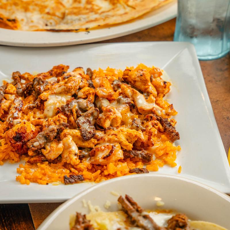 Chicken, steak, and shrimp served on a bed of Mexican rice covered with cheese sauce