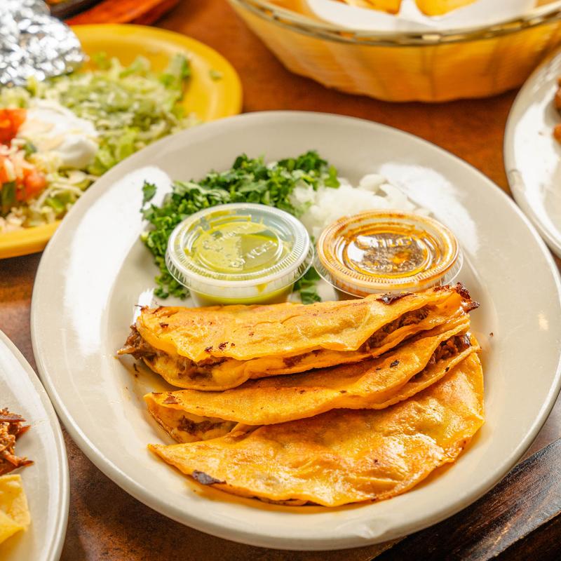 Two flour tortillas stuffed with cheese and your choice of Beef or Chicken. Served with lettuce, guacamole, sour cream, and pico de gallo