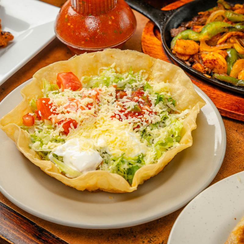 Crispy flour tortilla filled with choice cheese and diced tomatoes. Fajita-style beef, chicken & shrimp, beans, shredded cheese, lettuce, tomatoes and supreme sauce, then sprinkled with cheese